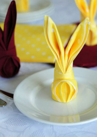 • Pour égayer votre table, vous pouvez aussi ajouter des serviettes en forme de lapin, avec cette technique de pliage, ou avec des simples oreilles de lapin avec un œuf à l’intérieur ou encore ce petit lapin imprimé et découpé dans un joli papier :